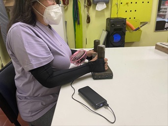 Prendas compresivas: Se utilizaron prendas compresivas en extremidades superiores (mangas/ guantes compresivos) durante sesiones seleccionadas de terapia y actividades de AVD con el objetivo de aumentar aferencia táctil profunda. La presión de las medias compresivas fue de 18 mmHg.