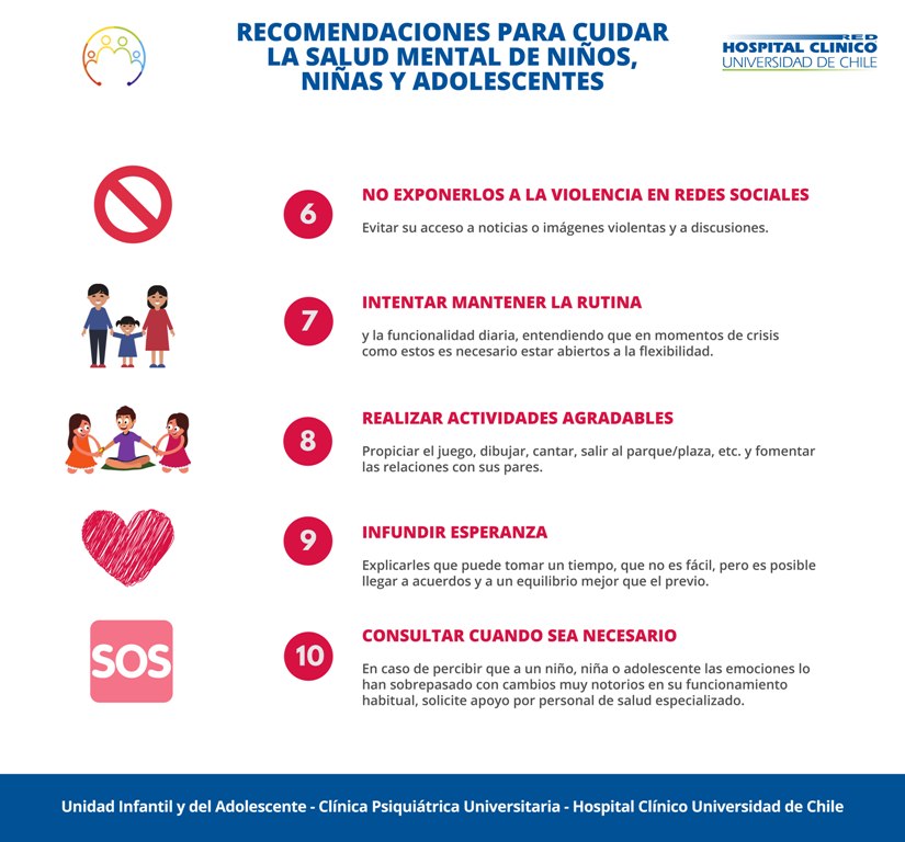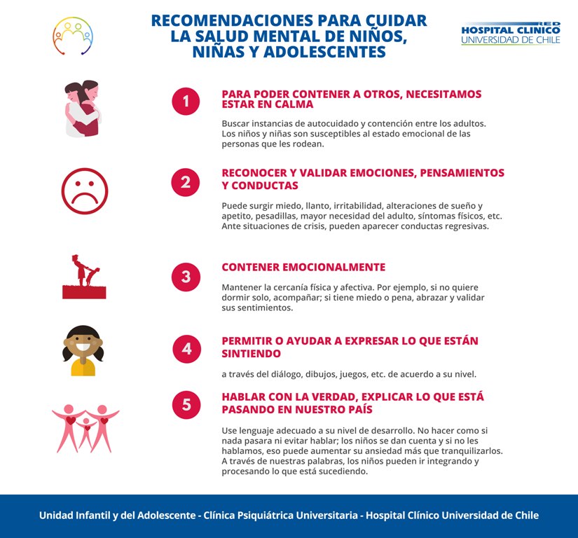 La Unidad de Psiquiatría Infantil y del Adolescente de la Clínica Psiquiátrica Universitaria HCUCH entrega algunas recomendaciones para cuidar la salud mental de los niños, niñas y adolescentes que se pueden ver afectados ante la situación actual de nuestro país.