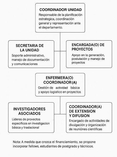 Apoyo administrativo: enfermera(o) coordinador(a) (gestión de actividades clínicas y apoyo logístico en proyectos) y secretaria de la Unidad (soporte administrativo, manejo de documentación y comunicaciones)